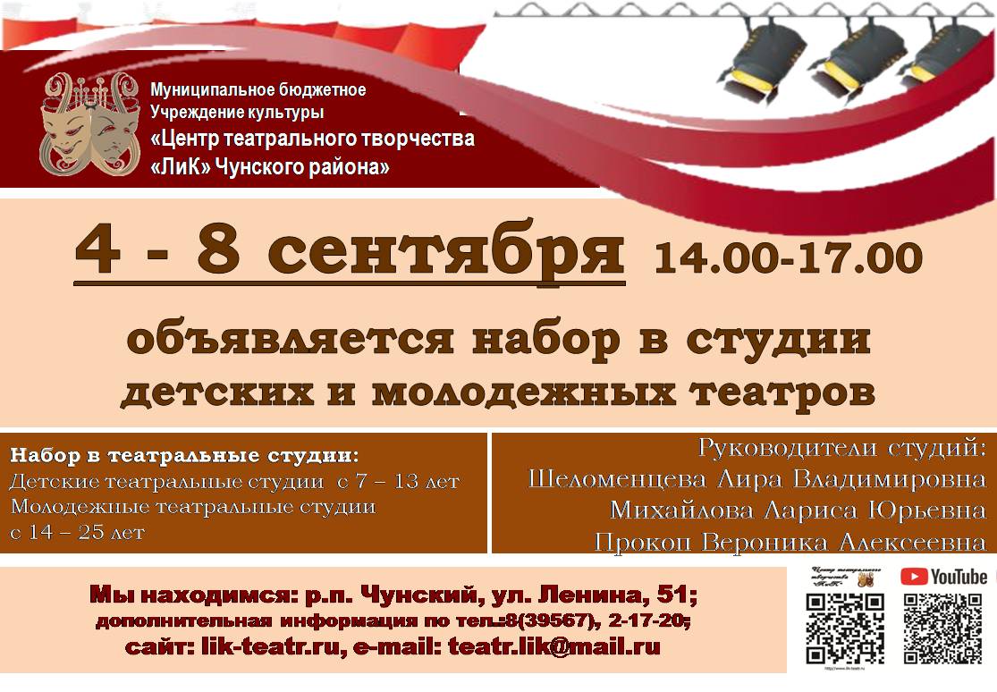 Муниципальное бюджетное учреждение "Центр театрального творчества "ЛиК" Чунского муниципального округа" (р.п.Чунский, ул. Ленина, зд. 51)
